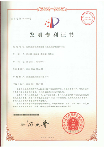 發(fā)明專(zhuān)利證書(shū)--內(nèi)聚光減容太陽(yáng)能中高溫集熱管的制作方法