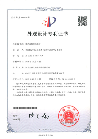 外觀設(shè)計(jì)專(zhuān)利證書(shū)--蓄熱式智能電鍋爐