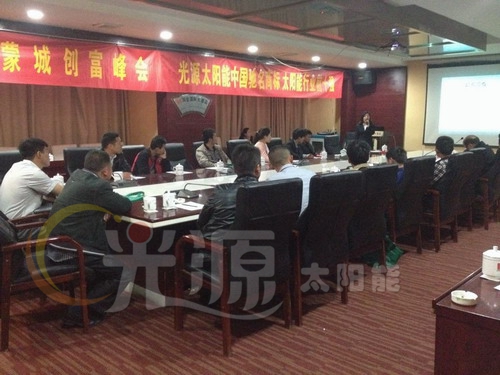 4月21日,光源太陽能安徽蒙城2014年經(jīng)銷商培訓(xùn)大會在蒙城國際大酒店舉行,來自蒙城的20余位的經(jīng)銷商參加了本次會議。