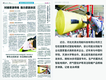 2018年11月22日,河北日報刊登河北光源太陽能科技有限公司生產(chǎn)蓄熱式智能電鍋爐的圖片新聞。