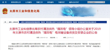 根據(jù)太原市工業(yè)和信息化局農(nóng)村清潔供熱“煤改電”領(lǐng)導(dǎo)小組辦公室制定的《太原市農(nóng)村清潔供熱“煤改電”電采暖設(shè)備供貨及安裝企業(yè)潛在投標(biāo)入圍資格一般要求和技術(shù)標(biāo)準(zhǔn)》(試行),經(jīng)專家委員會評審,確定河北光源太陽能科技有限公司為2019年山西太原市“煤改電”采暖設(shè)備入圍企業(yè)。入圍產(chǎn)品為:蓄熱式電鍋爐、蓄熱式電暖器。