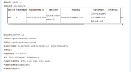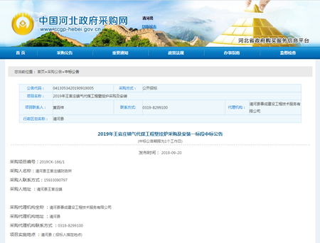 喜報頻傳,河北光源太陽能科技有限公司,在2019年09月16日,2019年王官莊鎮(zhèn)氣代煤工程壁掛爐采購及安裝項目的競標中,憑借過硬的產品質量,扎實高效的工作作風,卓越的運作團隊和良好的企業(yè)信譽,以絕對的優(yōu)勢順利中標。