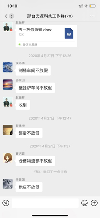 “制桶車間不休假、壁掛爐車間不休假、倉儲物流不休假、售后服務(wù)不休假、物資供應(yīng)不休假”,沒想到,通知經(jīng)微信發(fā)出,董事長李成彬和總經(jīng)理劉迎波連續(xù)接到員工表示不休假的請纓。