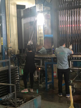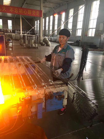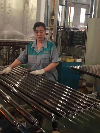 “五.一”這天,驕陽似火。室外溫度高達(dá)35度,真空管車間,在火考中作業(yè),工人們揮汗如雨戰(zhàn)高溫。他們的口號叫得響:寧流萬滴汗,不出一次品。