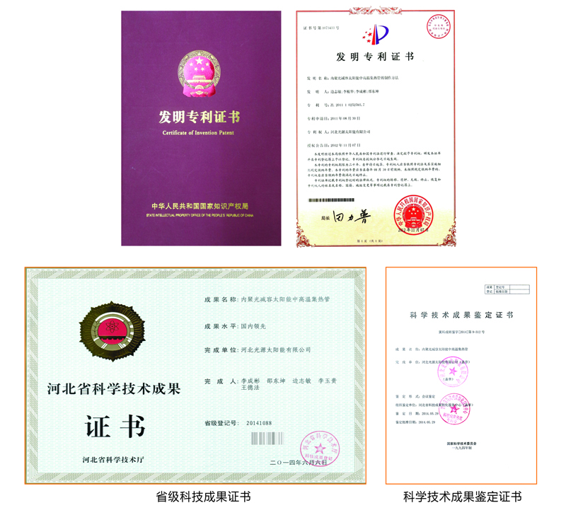 技術(shù)特點:一是內(nèi)置CPC反射器。外罩玻璃管與吸熱管采用同軸套管,在真空管內(nèi)壁下半周設(shè)置金屬拋物面反射器,運用拋物面原理實現(xiàn)了全角度采光,反射器不受大氣污染,聚光效果更好。二是耐高溫鍍膜技術(shù)。內(nèi)吸熱管表面濺射耐高溫太陽吸收膜層,內(nèi)外管之間抽真空,工作溫度400℃以上膜層不脫落、不老化。三是強制傳質(zhì)傳熱技術(shù)。在吸熱管內(nèi)插裝金屬套管,套管內(nèi)置入金屬導(dǎo)熱管,使管內(nèi)的介質(zhì)容量減少了70%,大大提高了傳質(zhì)傳熱效率。四是安全承壓技術(shù)。金屬套管與聯(lián)集箱采用絲扣連接,保證系統(tǒng)工作安全可靠。經(jīng)權(quán)威機構(gòu)檢驗,太陽能吸收比、熱損系數(shù)、真空品質(zhì)等技術(shù)指標(biāo)均優(yōu)于國家標(biāo)準(zhǔn)。采用該產(chǎn)品組成的太陽能中高溫?zé)崂孟到y(tǒng),穩(wěn)定工作溫度可達(dá)到163℃蒸汽,真正實現(xiàn)了太陽能由“熱水應(yīng)用”到“熱能應(yīng)用”的跨越式提升,填補了國內(nèi)太陽能中高溫真空集熱管在160℃溫區(qū)的技術(shù)空白??萍汲晒b定認(rèn)為:該產(chǎn)品的綜合性能達(dá)到了“國內(nèi)領(lǐng)先水平”,系統(tǒng)可廣泛用于太陽能飲用開水、采暖制冷、食品加工、紡織印染、農(nóng)副產(chǎn)品烘干等多種行業(yè)。對促進大氣污染治理,推動我國能源結(jié)構(gòu)調(diào)整具有重要意義。